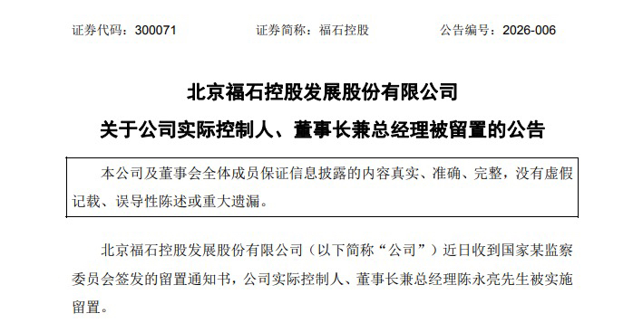 揚子晚報網(wǎng)2月2日訊(記者 范曉林 薄云峰)福石控股2月1日晚間公告,公司實際控制人、董事長兼總經(jīng)理陳永亮被實施留置。