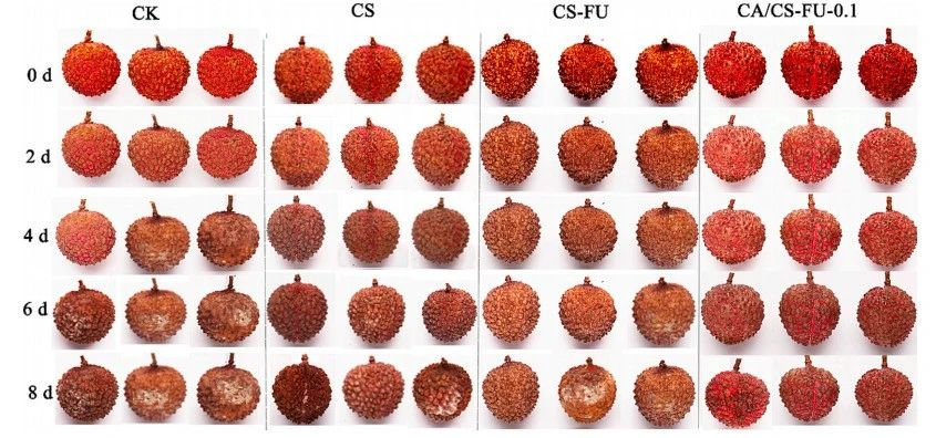 嶺南師范大學(xué)劉鍇棟團隊利用殼聚糖(CS)和氧化褐藻糖膠(CS-FU)以及包封肉桂醛(CA) 制備的一種可食用復(fù)合薄膜可以顯著提高荔枝的保鮮時間(>8 天)(文獻圖片)