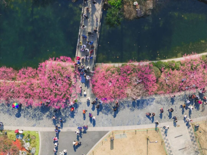 與常州遙相呼應(yīng),江城武漢的東湖梅園里,三萬余株梅花傲雪凌霜。梅香幽幽、沁人心脾,身著漢服的游客梅下留影,闔家出游的市民漫步賞梅,盡享團圓溫馨時光。紅燈籠點綴在紅白梅枝間,歡聲笑語漫過整個園區(qū),將江城的年味渲染得熱氣騰騰。